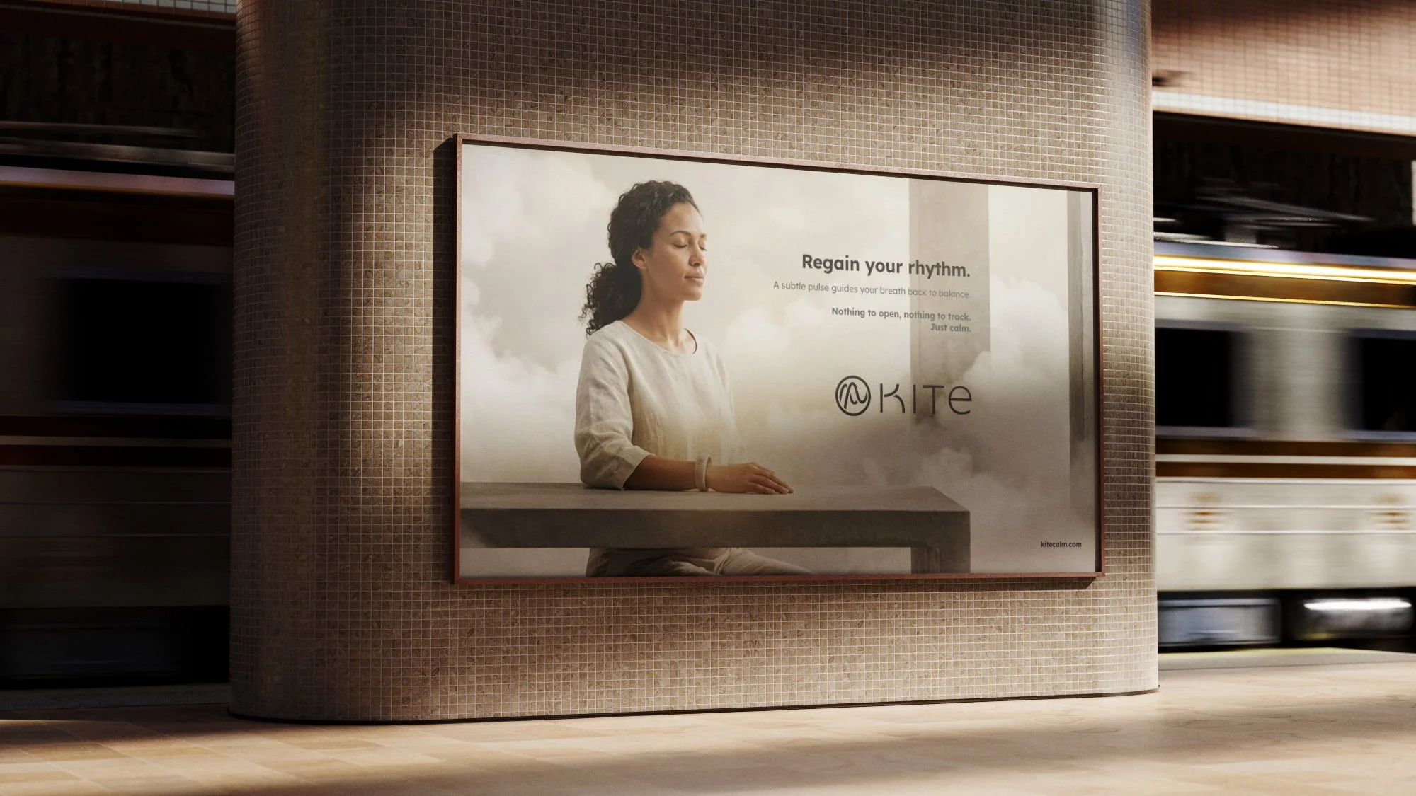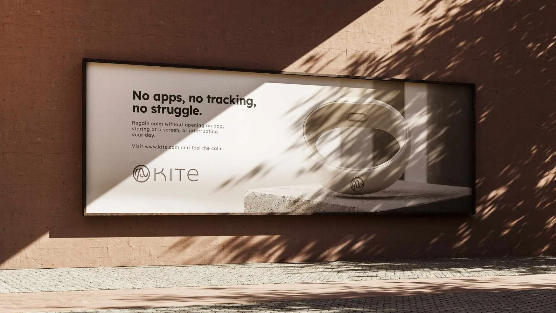 A conceptual brand identity created for KITE, a fictional health-tech wearable designed to help overstimulated professionals regain calm through subtle haptic cues and guided breathing.